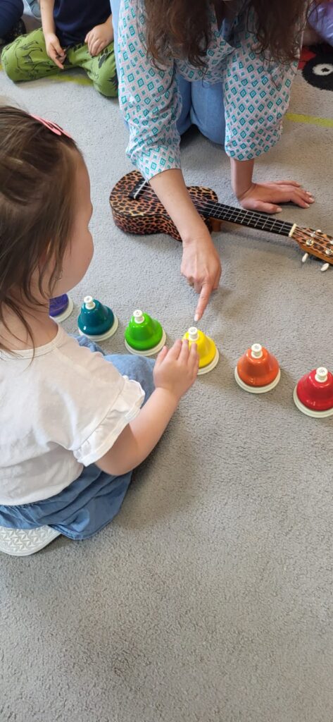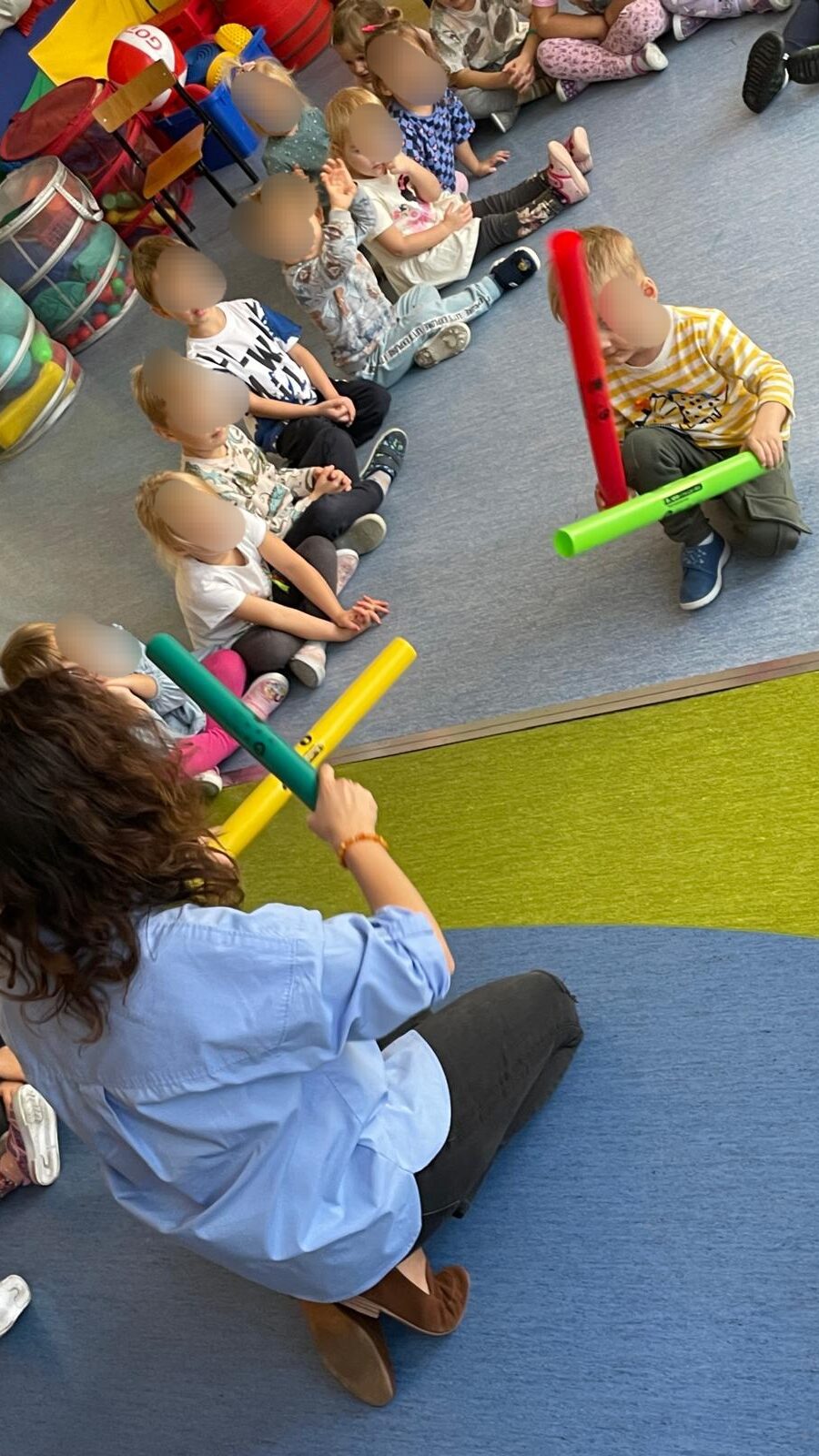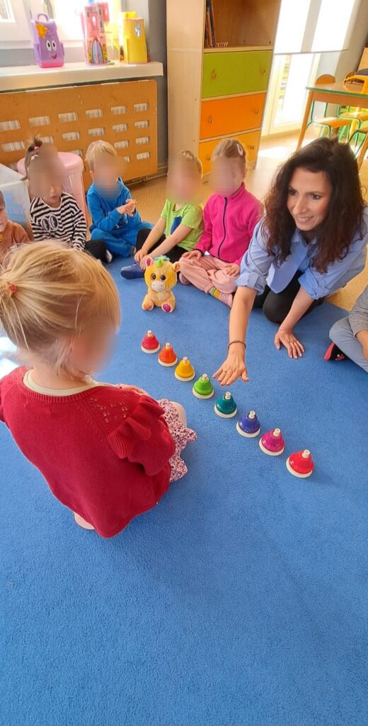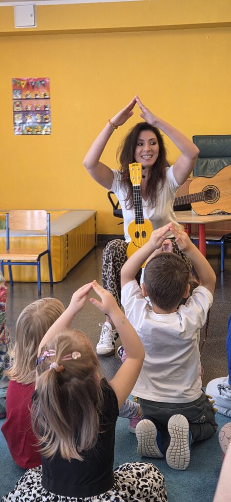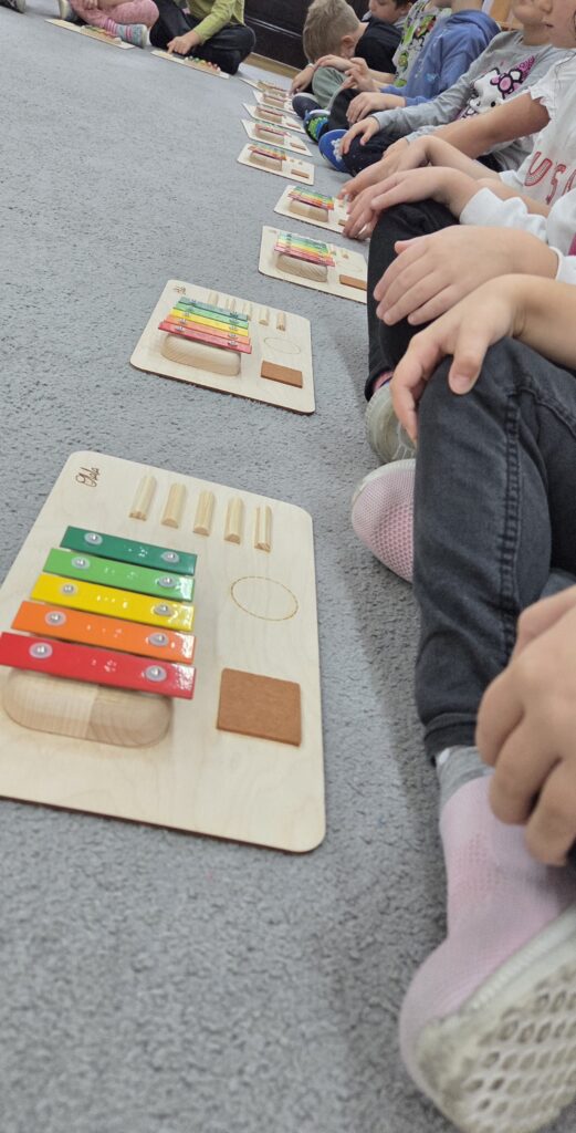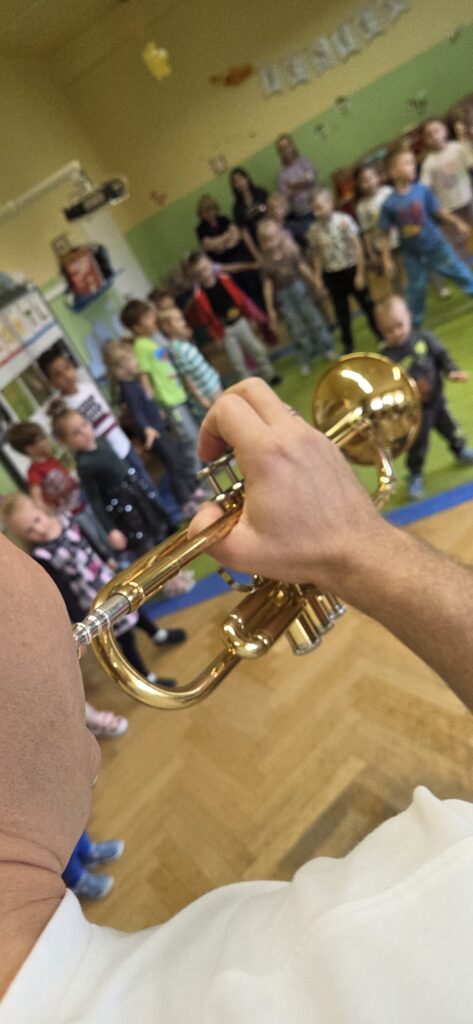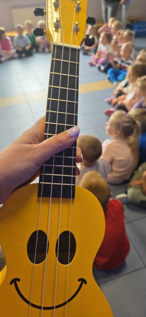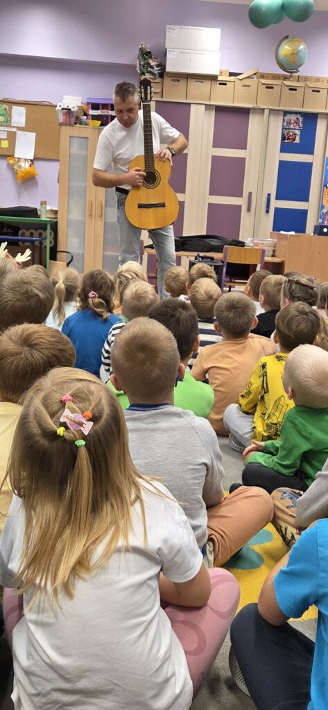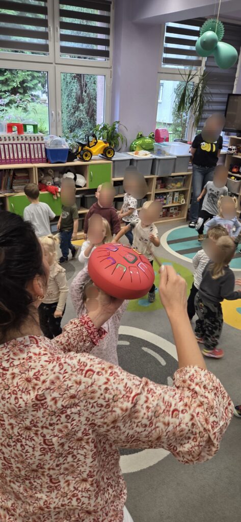 Jako twórca linii własnych instrumentów dedykowanych placówkom przedszkolnym i szkolnym, naturalnie wykorzystuję podczas zajęć Tabliczki Muzyczne Olala, Rytmiczne Rybki oraz Gramisia. Instrumenty te wzbogacają proces dydaktyczny i inspirują dzieci do aktywnego uczestnictwa w zabawach muzycznych. Zabawy muzyczne są wspaniałym sposobem na obcowanie z muzyką. Podczas zajęć często korzystam również z chust animacyjnych, woreczków korekcyjnych czy mat dydaktycznych, które wspierają rozwój ruchowy i koordynacyjny dzieci. Zabawy ruchowe odbywają się przy akompaniamencie ukulele lub pianina, co dodatkowo podkreśla ich muzyczny charakter. Na moich zajęciach nie brakuje swobody, improwizacji i uśmiechu. Wszystkie działania realizuję poprzez zabawę, dbając o przyjazną i twórczą atmosferę.